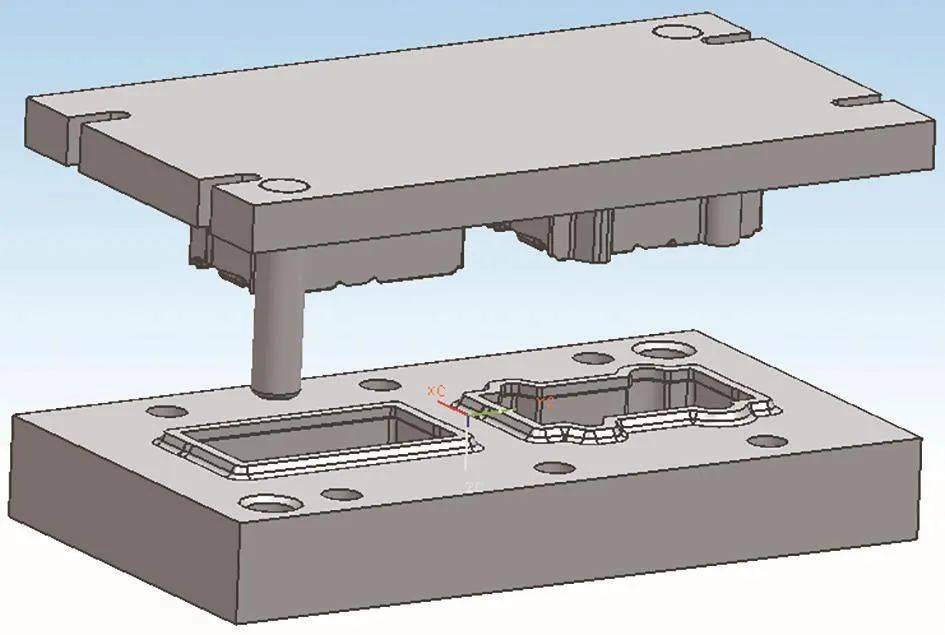 8、切边模设计。切边模设计有2个型腔(图4),右侧为预锻后切边,切边时保留部分飞边用作终锻时顶料,左侧型腔为终锻后切边型腔。为了保证切边精度,切边上下模间隙设计为0.8mm,设计导柱导套结构用于切边模装配定位和控制上下模间隙尺寸精度。